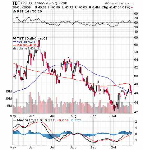Unfortunately, swaps as the best way to play this trade, are not available to regular retail investor; but there are two products (I am aware of only these two) a retail investor can play this trade; and both have their negatives. The options are either shorting iShares Barclays 20+ Year Treas Bond ETF (TLT) or being long UltraShort 20+ Year Treasury ProShares ETF (TBT). Options are available on both of these ETF’s (options come their negatives). TLT is trying to replicate price and yield performance of the Barclays Capital U.S. 20+ Year Treasury Bond Index. TBT is trying to replicate double inverse daily performance of Lehman Brothers 20+ Year U.S. Treasury index, so it could have large tracking error.