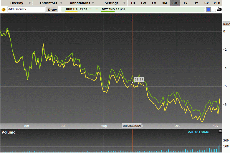 Divergence yesterday between PowerShares DB US Dollar Index Bullish and index that it tracks Dollar Index (DXY) as fund manager used up SEC registered shares. Similar to United States Natural Gas earlier this year, covered on Tainted Alpha. DB Commodity Services LLC filledĀ to the U.S. SEC to register 100,000,000 additional shares in order to meet investor demand. Reuters story:Deutsche Bank unit files for 100 mln new UUP shares. Also, more important large volume in call options, looks someone is looking to profit on short covering/squeeze.