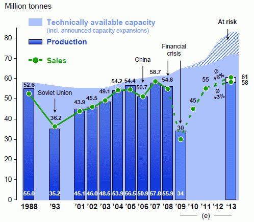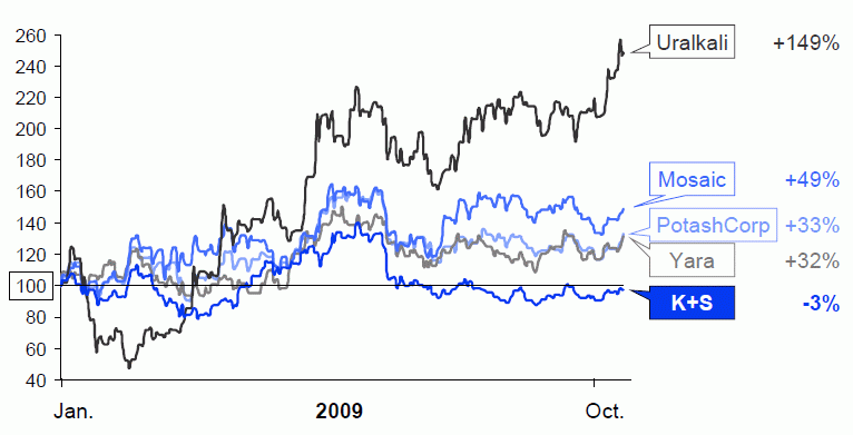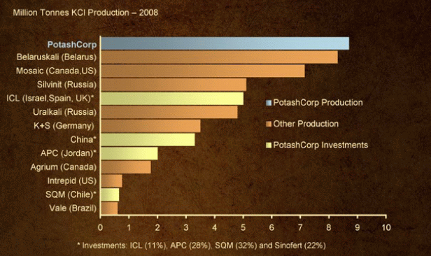 Belisarius cough an interview with the K+S CEO Norbert Steiner on CNBC this morning and got interested in potash producers on the Mr. Steiner words that he expects 50% increase in demand measured by volume. The K+S is the seventh largest potash producer in the world (PotashCorp data) . Earnings today came out below consensus, and raised issues on company’s debt covenants and credit rating. More in these two Bloomberg articles: K+S Profit Almost Wiped Out on Slumping Demand for Fertilizers; K+S Seen Needing Share Sale After Potash Profit Wiped. Video: