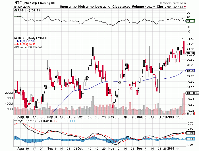 - Intel (INTC): Q4 EPS of $0.40 vs. consensus of $0.10. Revenue of $10.6B (+28%) vs. $10.2B. Gross margin of 65%.