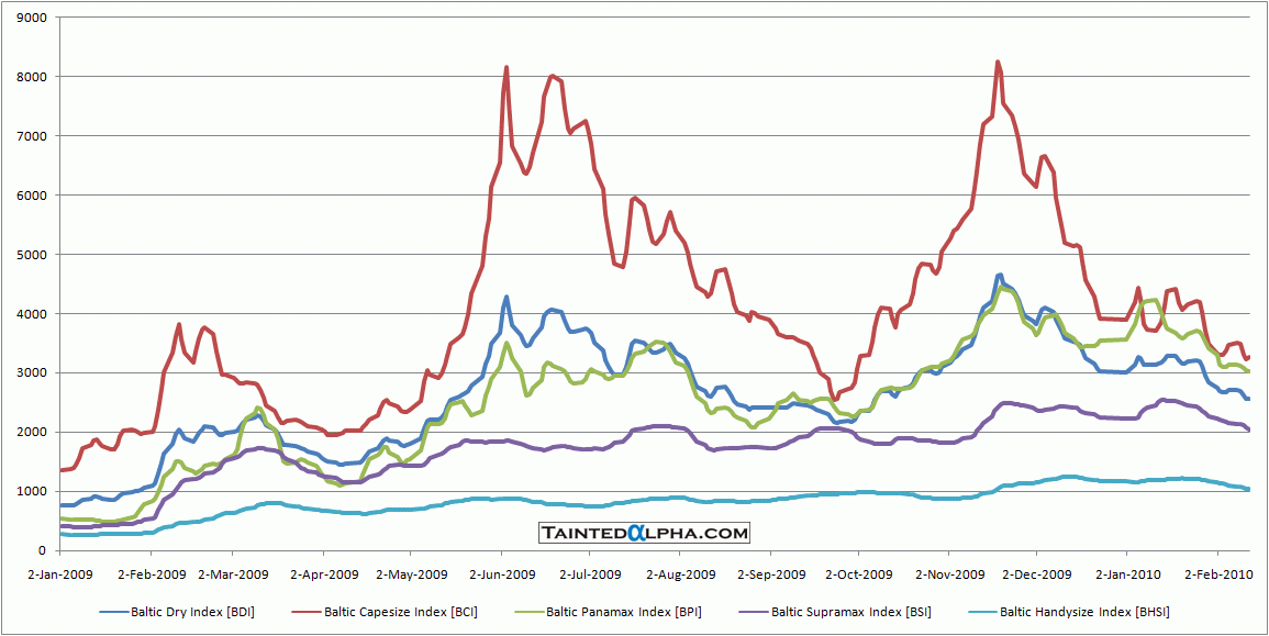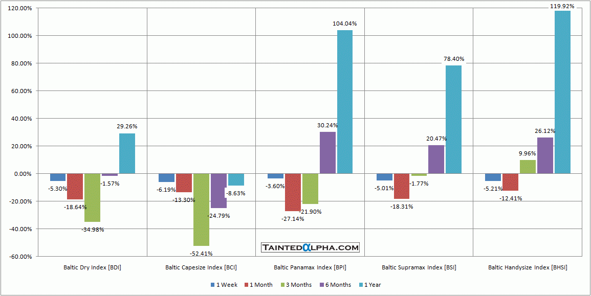 Baltic dry index fell 5.3% in the last week. Panamaxes outperformed the BDI, while Capesizes underperformed. For the time being dry freight weakness is due the slowdown of Chinese imports because of Chinese New Year and accompanying. This is also a reason for Capesize underperformance because this type of ships usually haul iron ore and coal and China imports most of these commodities.