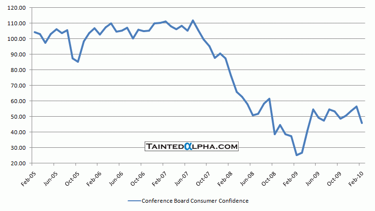 Markets are down, the negative surprise was Conference Board Consumer Confidence which came out at 46 vs. 55 consensus and 56.5 for January.