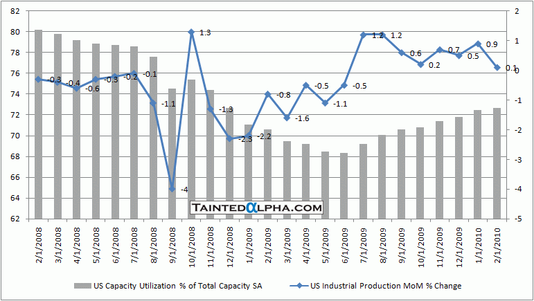 U.S. industrial production rose 0.1% in February. The Consensus was at 0%, January reading at 0.9%. Capacity utilization rose from 72.6% in January to 72.7%; the consensus was at 72.4%.