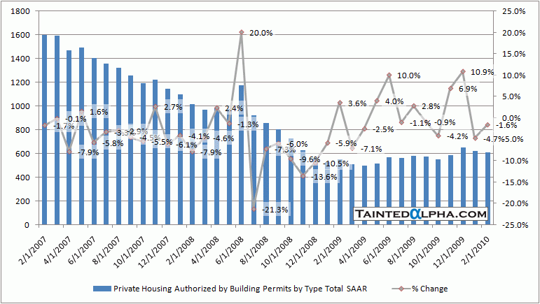 U.S. housing starts came out at 575.000 vs. 565.000 consensus and 591.000 in January. Building permits in the same period fell 1.6% to 612.000.
