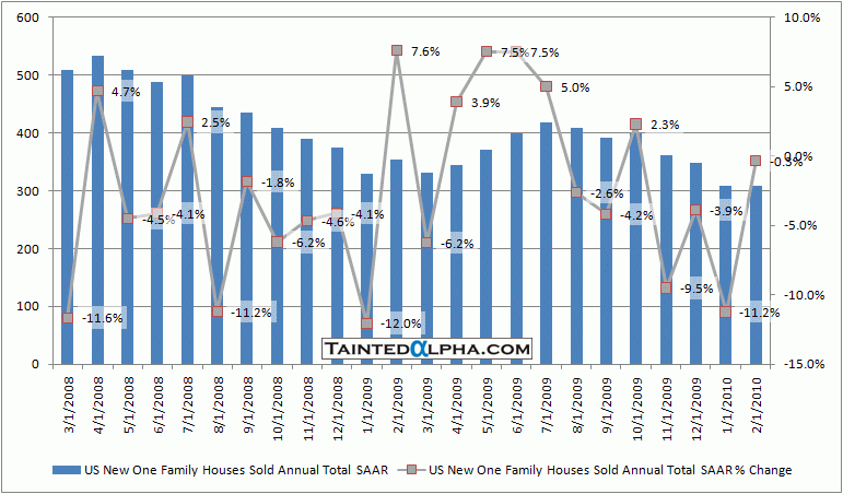 New home sales fell -0.3% in February to 308.000, consensus was at 315.000. The disappointing news on U.S. housing continue…