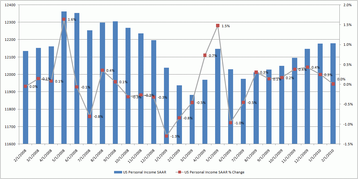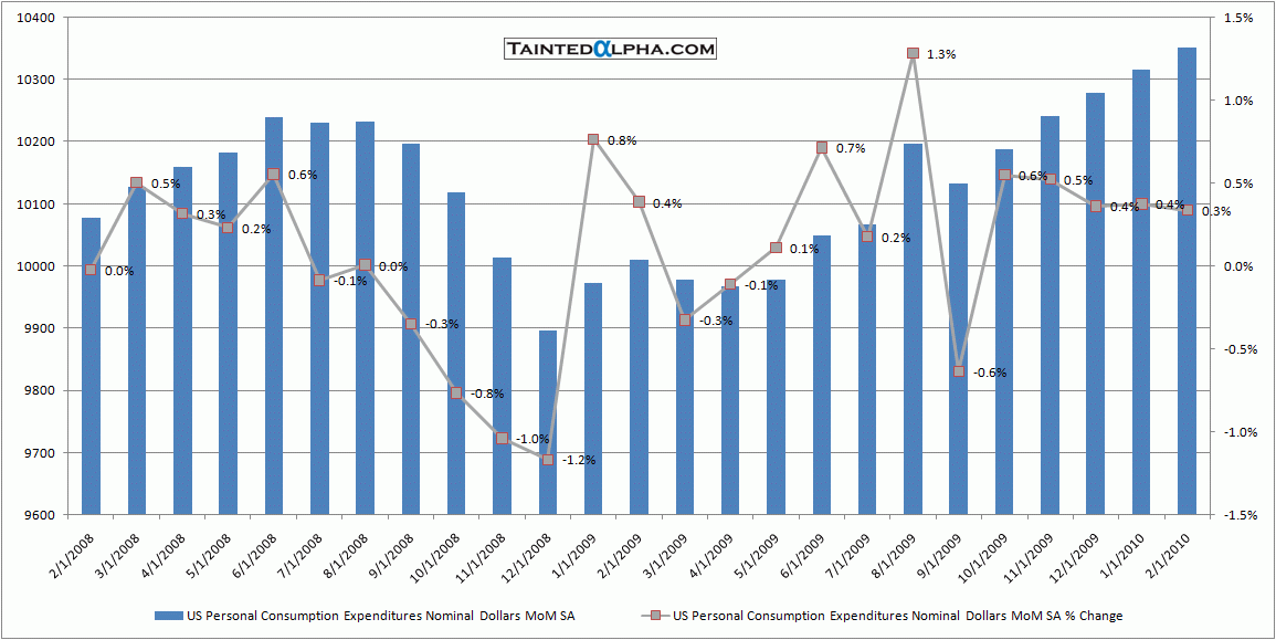 Personal income was flat in February vs. the +0.1 consensus and January reading of also +0.1%. Consumer spending for February came out at consensus of 0.3%; the prior reading was 0.5%.