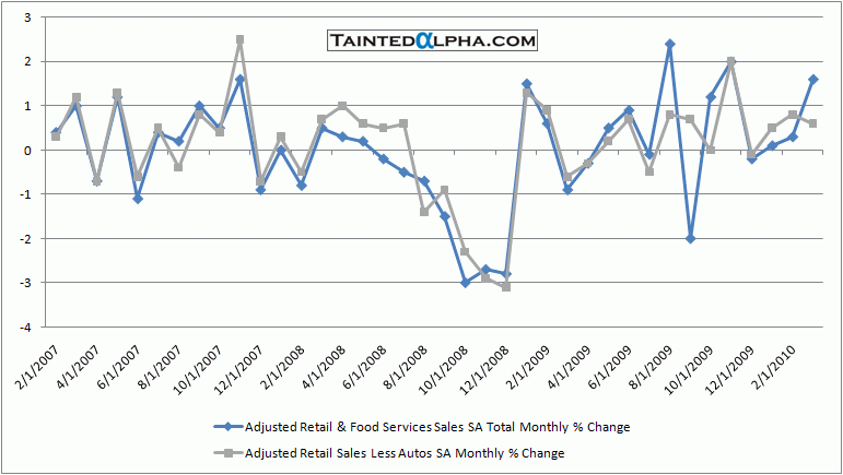 Retail sales rose 1.6% in March . The consensus was at 1.2%, February reading at 0.3%. Autos taken out, the figure was 0.6%; the consensus was at 0.5%; prior reading at 0.8%.