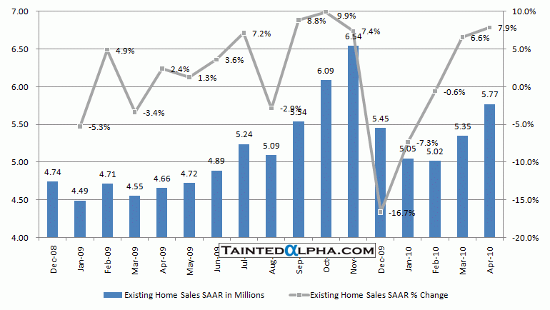 Existing home sales rose 7.9% to 5.77 million SAAR. Consensus was at 5.6 million. Again, the first home buyer tax credit expiring.