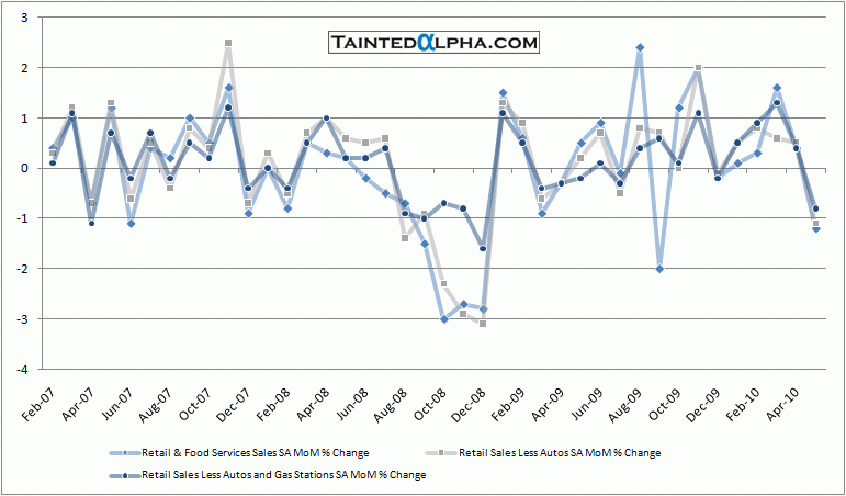 Retail sales fell 1.2% in May . The consensus was at 0.2%, April reading was a gain of 0.4%. Autos taken out, the figure was -1.1%; the consensus was at 0.1%; prior reading at 0.4%.