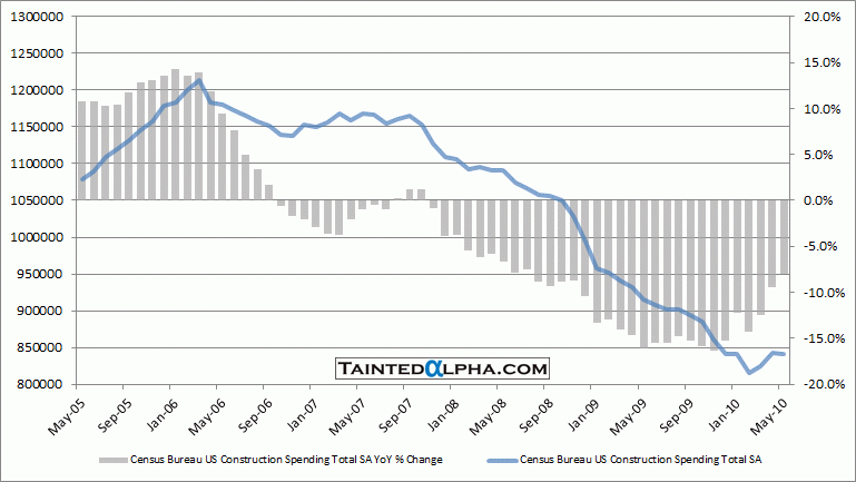 In May, U.S. construction spending fell 0.2% MoM vs. -0.5% consensus and 2.7% rise in April.