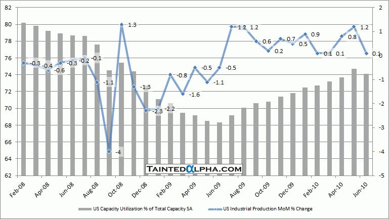 Capacity utilization fell, for the first time since the recovery started, to 74.1% in May it was at 74.7%; the consensus was at 74.0%.