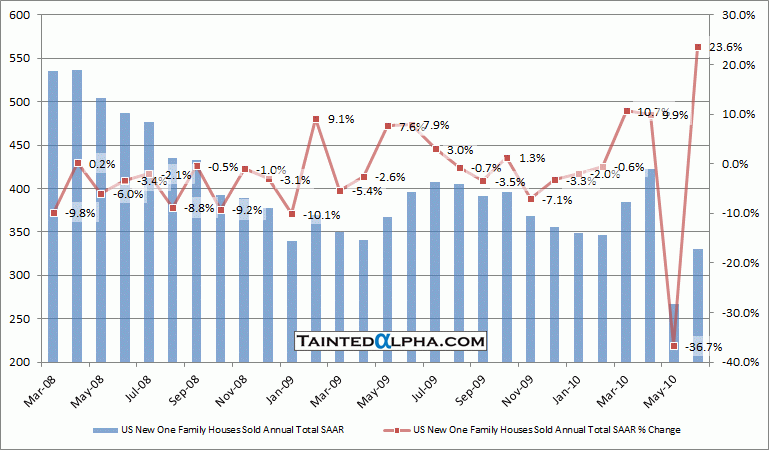 New home sales rose 23.6% in June to 330.000, the consensus was at 300.000, prior reading (revised downward 33.000) was at 267.000 (!!! worst reading on record).