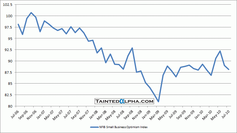 NFIB Small Business Optimism Index for July was reported at 88.1 vs. consensus of 88.0 and prior reading of 89.0. Readings at this level are consistent with weak recovery/recession.