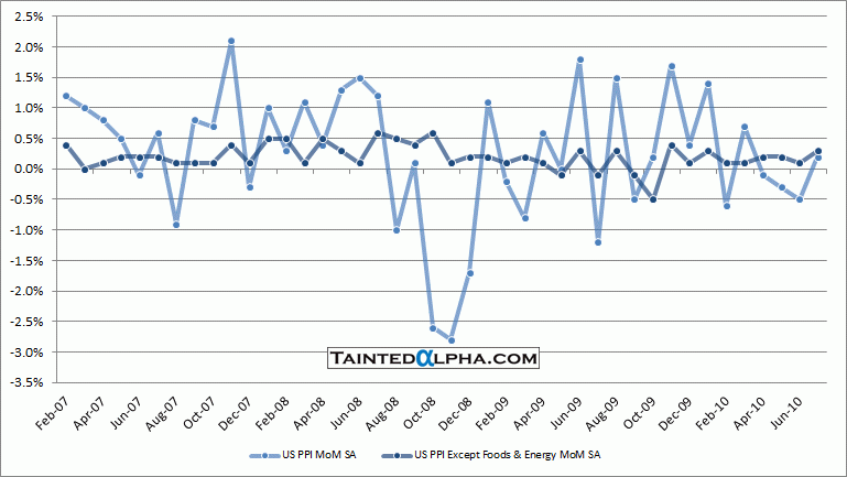 U.S. producer price index rose 0.2% in July, right at the consensus. June reading was at -0.5%. Food & energy taken out U.S. producer price index rose 0.3% in July. The consensus was at 0.1%, prior reading at 0.1%.