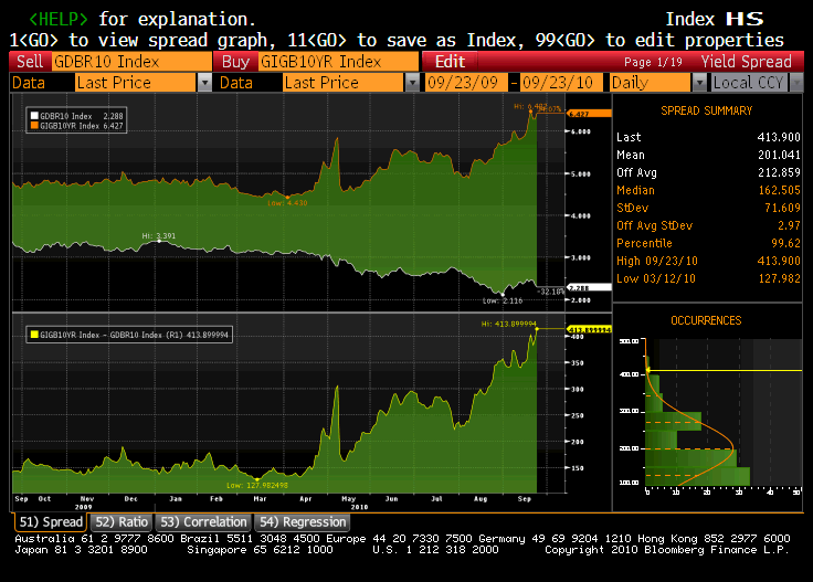 Irish and Portuguese 10 year government bond yield spread versus same maturity German keep on rising. Latest rumors are that tha Anglo Irish creditors will not be paid off in full.