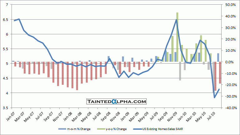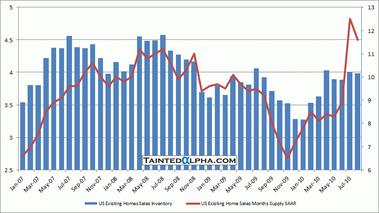 Existing home sales in July were depressed by first home-buyer tax credit program expiration. Bounce after that seems quite weak. Moths of supply still mighty high.