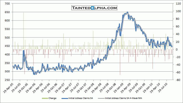 Initial jobless claims in the U.S. were reported at 445.000. The consensus was at 455.000, last week revised (up 3.000) reading was at 456.000.