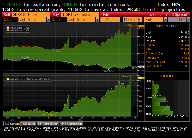 Irish spreads reached a new high today an German demands of determining a burden sharing plan on any future bailouts. In short Germany refuses to underwrite all of the peripheral Europe new debt. This raised some restructuring talk in the markets.