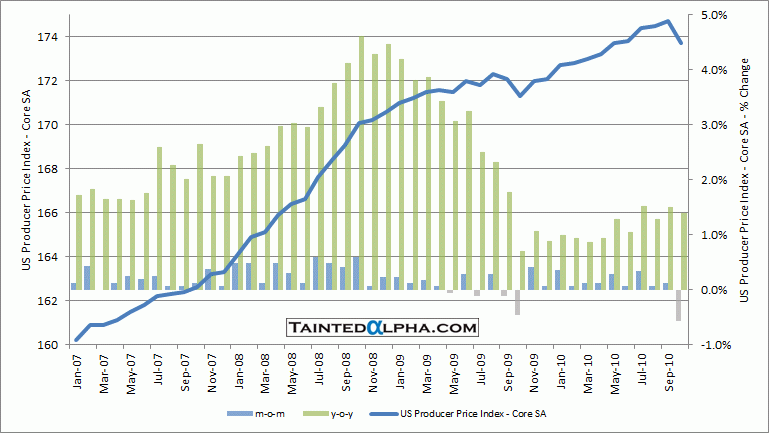 This is quite negative for company margins: rising commodity prices increase expenses (as depicted by rising PPI) while weak demand erodes pricing power(as depicted by falling core PPI). If it continues this could be the first unintended consequence of QE that adversely effects the economy.