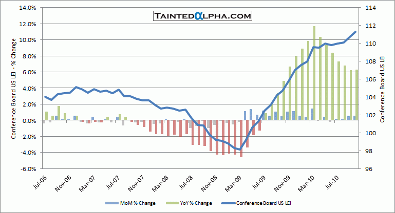 Conference Board Leading Economic Index (LEI) rose 0.5% in October. The consensus was at 0.6%, prior revised reading (from +0.3%) was at 0.5%. On year level LEI is up 6.0% vs. 6.8% in August.
