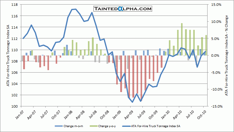 ATA Chief Economist Bob Costello said that truck tonnage changes over the last couple months shows there are some bright spots in the U.S. economy. “October tonnage levels were at the highest level in three months, even after accounting for typical seasonal shipping patterns. These gains fit with reports out of both the manufacturing and retail sectors and show there is a little bit of life in this economic recovery. ”