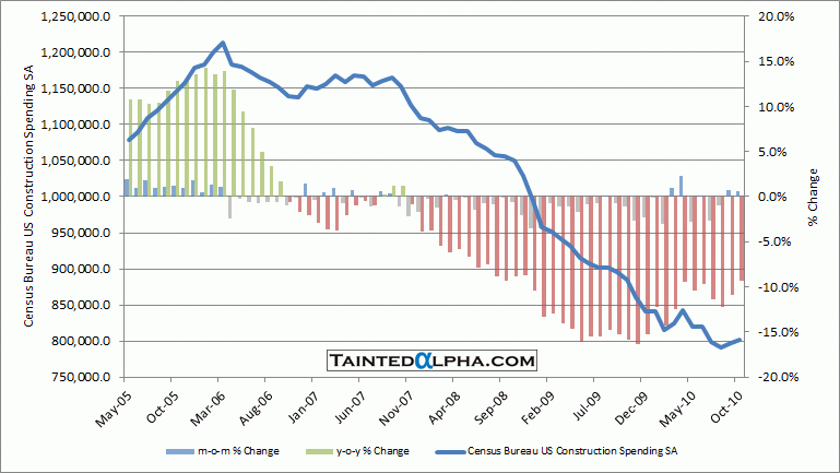 U.S. construction spending rose 0.7% October vs. -0.4% consensus and revised (down -0.2%) 0.7% rise in September. On year level we are at -9.3%.