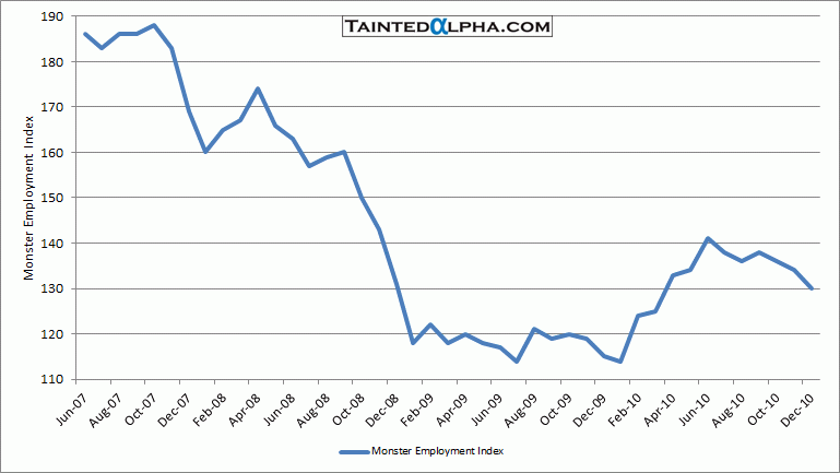 Monster Employment Index fell to 130 in December; November reading was at 134.