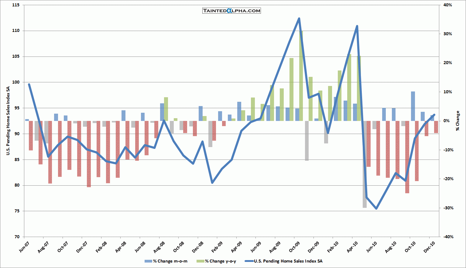 To repeat: Generally rising pending home sales are positive for the economy, but currently and until excess unsold housing inventory is cleared rising pending home sales index could mean more foreclosed homes are being sold at depressed prices which puts additional pressure on home prices. Thing to watch.