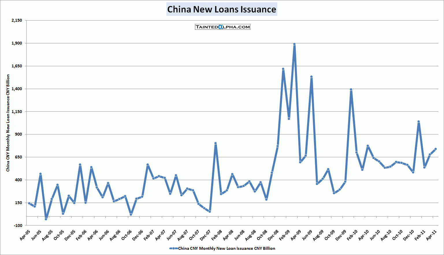 Chinese banks issued CNY 740 billion of new loans in April vs. CNY 679.5 billion in March and consensus of CNY 700.0 billion. The government has not provided a target for this year, but inferring on Q1 numbers the pace of loan growth could be similar to last years pace.