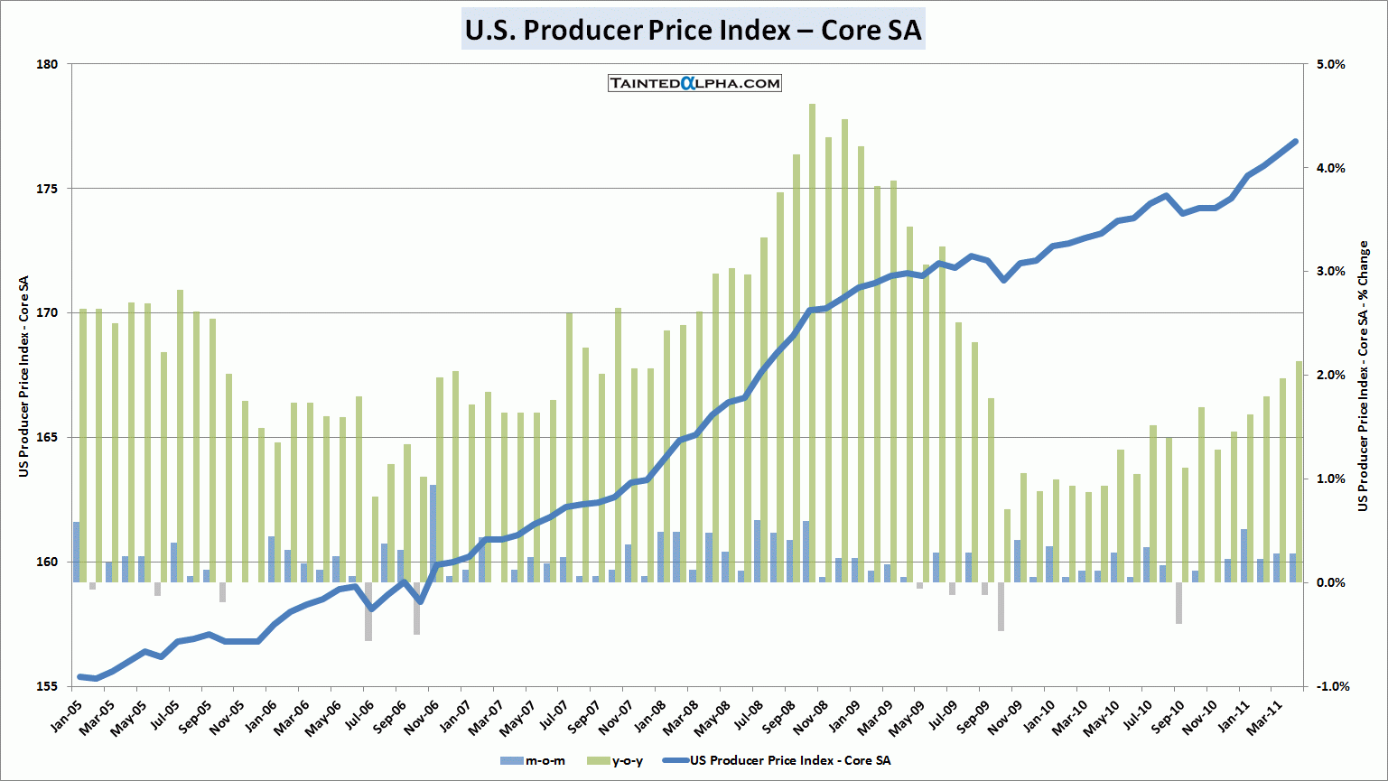 Food & energy taken out U.S. producer price index rose 0.3% in April; Consensus was at 0.2%; Prior reading was at 0.3%. On year level core PPI is up 2.1%.