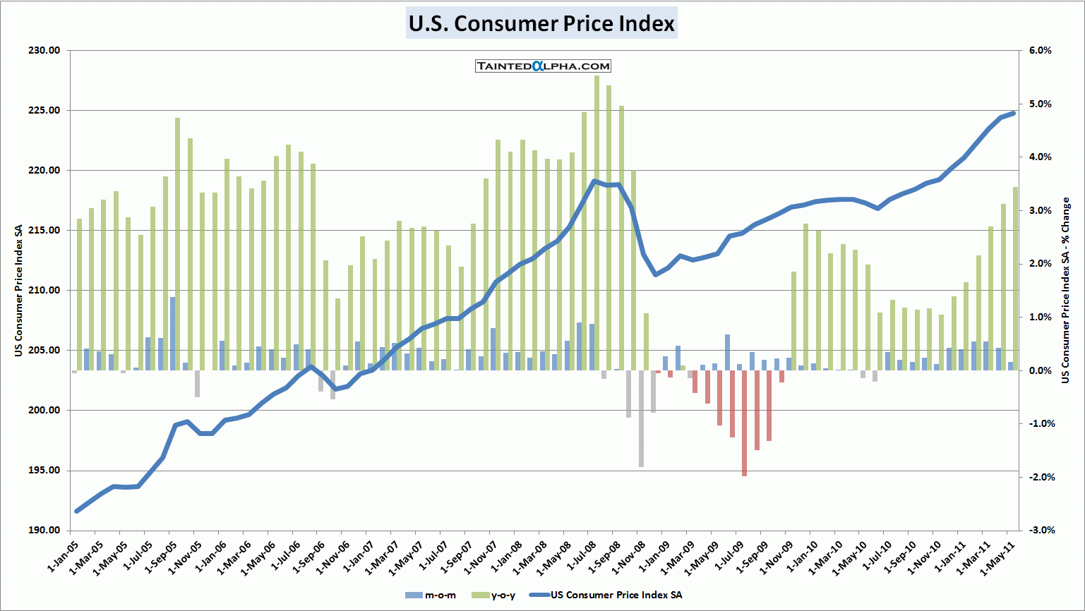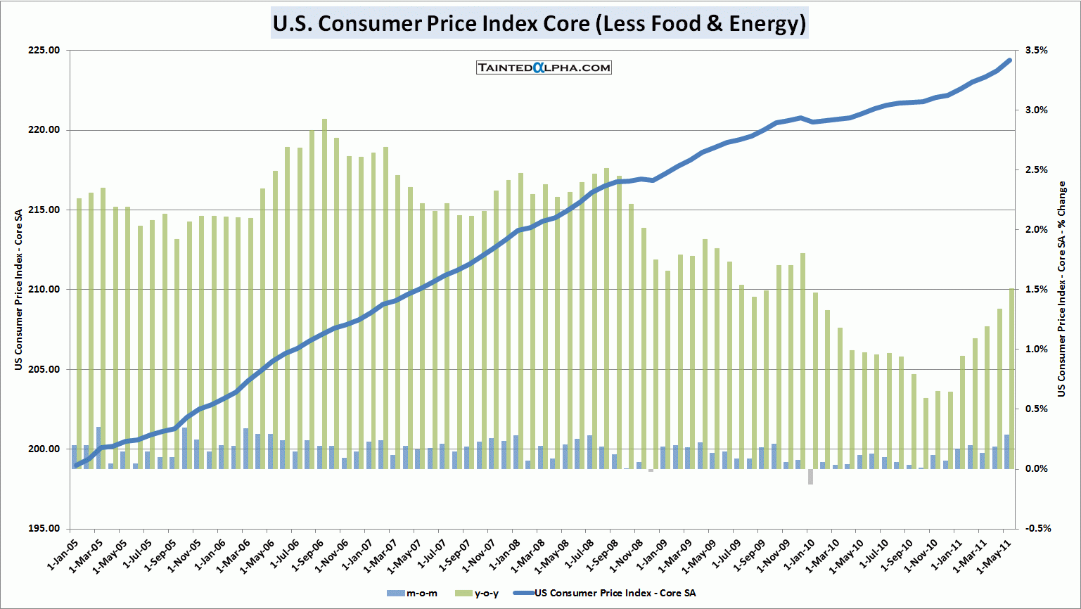 U.S. consumer price index rose 0.2% in May vs. 0.1% consensus and April reading of 0.4%. On year level CPI inflation is running at 3.6%.