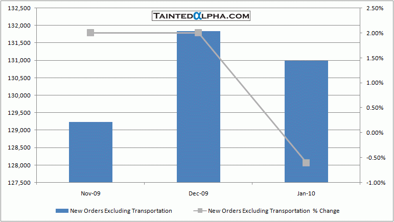 A negative surprise if we take airplanes out; Durable goods orders rose 3% vs. 1.5% consensus and 0.3% prior reading; Durable goods orders excluding transportation fell -0.6% vs. 0.9% growth in December.