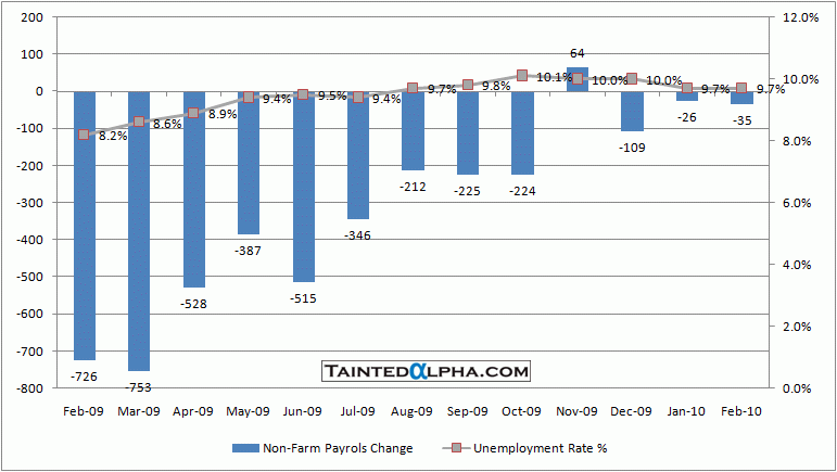 As I expected non-farm payrolls came out yesterday at -36.000 for February vs. -50.000 consensus and a revised -26.000 figure for January. Unemployment rate was unchanged at 9.7% vs. 9.8% consensus.