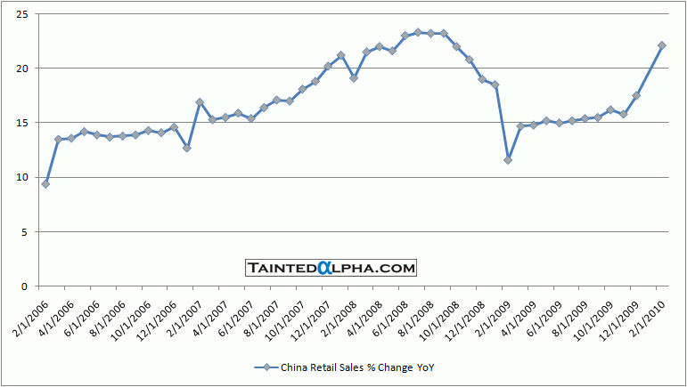 Retail sales are running strong, but inflation taken in account the rise is not so stellar. We could view retail sales in China as a lagging indicator, because consumption is a byproduct of exports. So, maybe a slowdown here also.