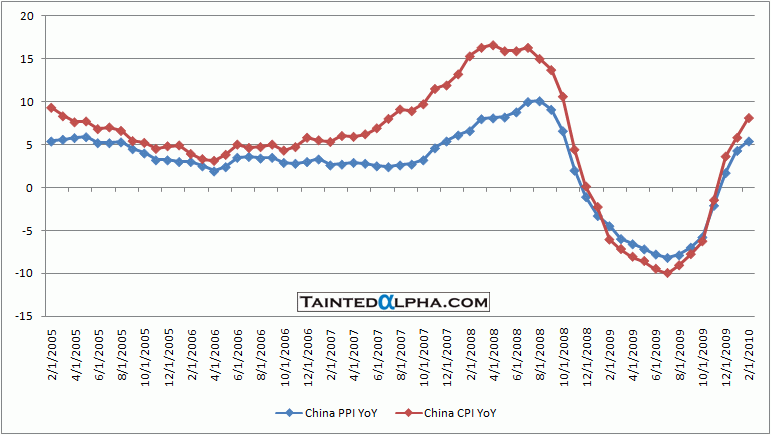 Money supply (measured by M2) has come down almost 20% from the high. The loan issuance in January was as usual extremely strong, but an outlier (the loan issuance was moved from 2009 to 2010. The loan growth still strong, could be a fuel for inflation.