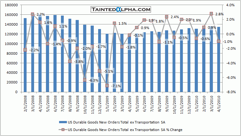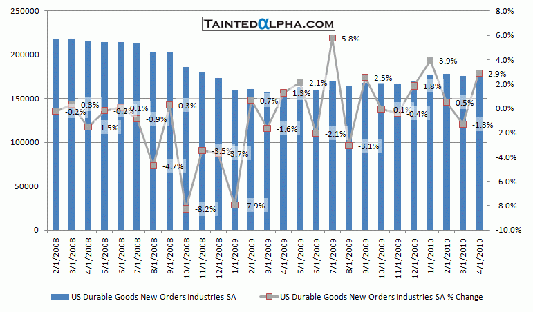 Durable good orders rose 2.9% In April vs. 1.5% consensus and 1.3% decrease in March. Transportation taken out the figure was a decrease of 1.0% vs. 2.8% rise in March.