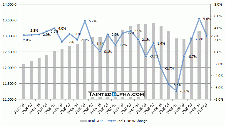 U.S. GDP growth in Q1 2010 was revised fromĀ 3.0% to 2.7%. The consensus was at 3.0%, Q4 reading was at 5.6%.