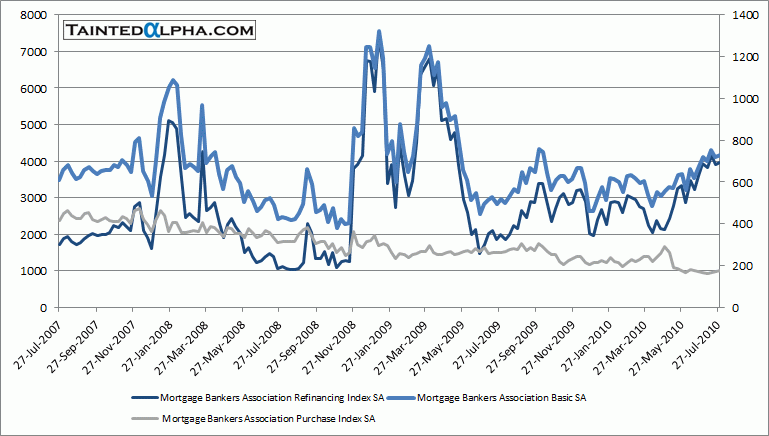 MBA mortgage applications rose 1.3% for week ending July 30, the prior reading was a decrease of 4.4.%. Refinance index rose 1.3%; Purchase index rose 1.5%.