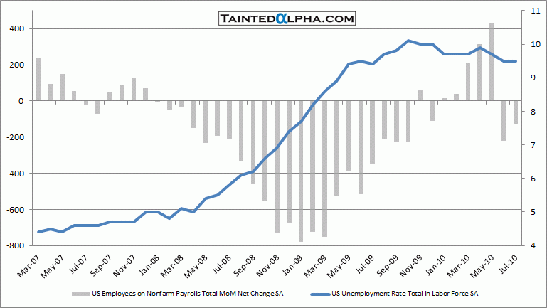 Nonfarm payrolls fell 131.000 in July. The consensus was at -65.000, revised reading for June was a decrease of 221.000. The unemployment was reported at 9.5% vs prior reading of 9.5% and consensus of 9.6%.