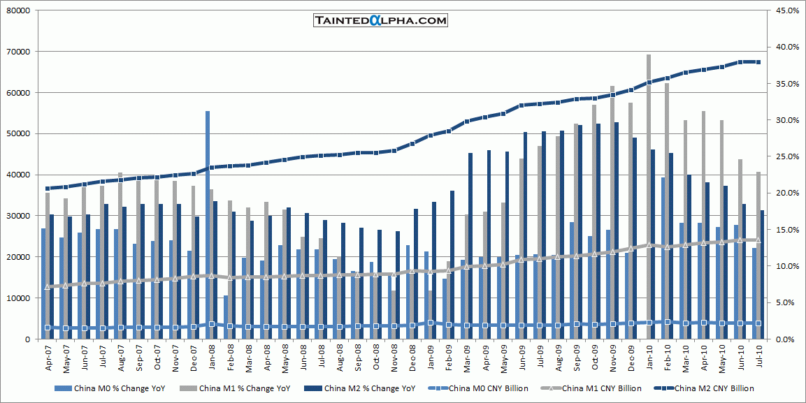 The most broad measure of money supply – M2 rose 17.6% YoY in July vs. 18.5% consensus and 18.5% growth in June. Chinese government reigning in on monetary expansion.