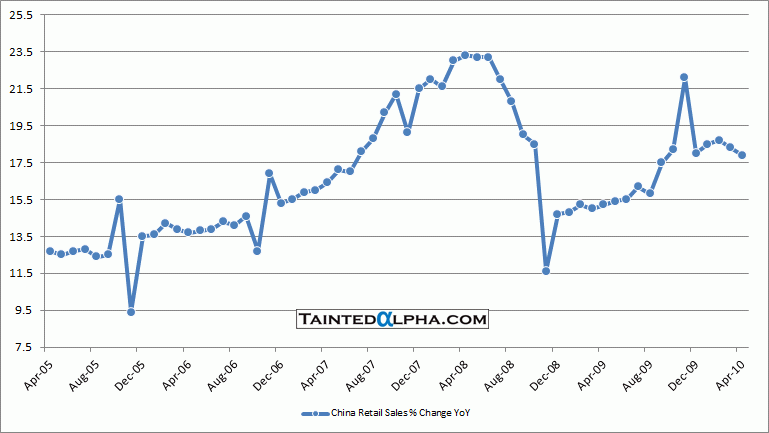 China retail sales rose 17.9% in July vs. 18.5% consensus and 18.3% growth in June.
