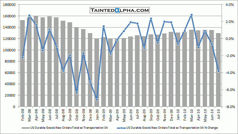 Durable good orders fell 0.3% in July vs. +2.5% consensus and -1.0% decrease in June. Transportation taken out the figure was a decrease of whopping -3.8% vs. -0.6% fall in June.