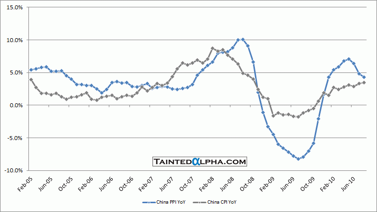 China Consumer Price Index was up 3.5% in August, right at the consensus. June reading was also at 3.5%. China Producer Price Index was up 4.3% in August vs. 4.5% consensus and 4.8% July reading.