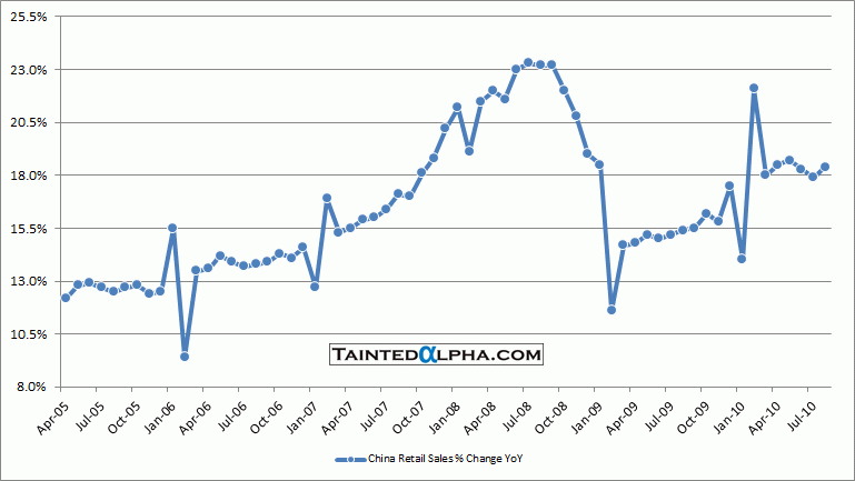 China retail sales rose 18.4% in August vs. 18.0% consensus and 18.2% growth in July.