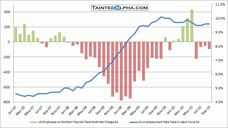 Nonfarm payrolls fell 95.000 in September. The consensus was at -8.000, August reading was revised (-3.000) decrease of 57.000. The unemployment was reported at 9.6% vs. prior reading of 9.6% and consensus of 9.7%.