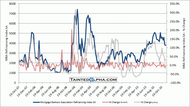 MBA Refinancing index fell -1.0%; Prior reading was a decrease of 16.5%; On year level MBA Refinancing Index is up 34.6%.