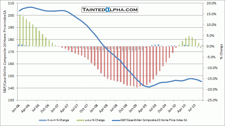 Seasonly adjusted S&P/Case-Shiller HPI 20 city composite fell 0.8%; On year level 20 city index is up 0.5%.