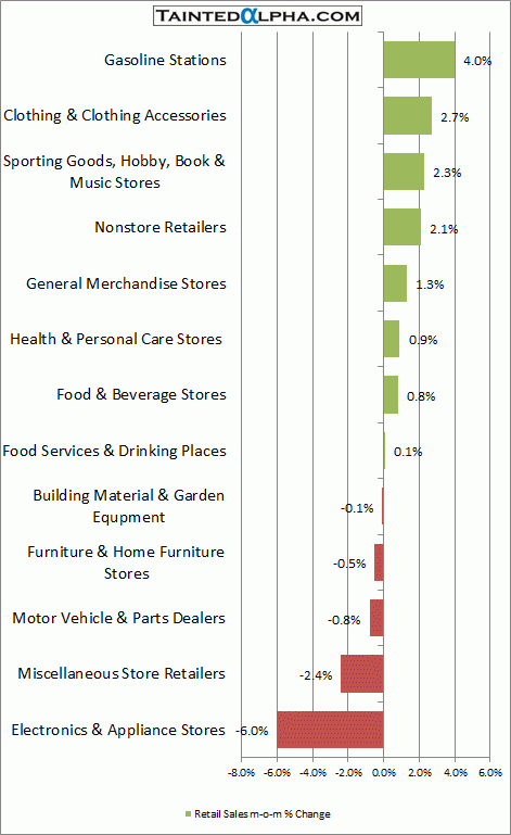 Most notable gainers: gasoline stations +4.0% m-o-m; clothing & clothing accessories +2.7%; Most notable losers: electronics & appliance stores -6.0%; miscellaneous store retailers -0.7%.
