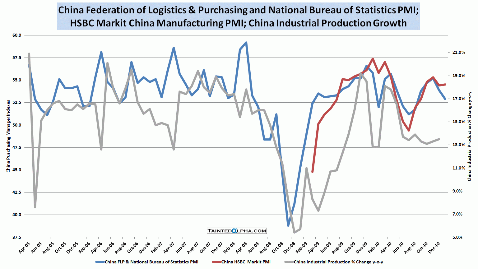 Official (China Federation of Logistics & Purchasing and National Bureau of Statistics) China PMI fell form 53.9 to 52.6; HSBC/Markit PMI rose from 54.4 to 54.5.