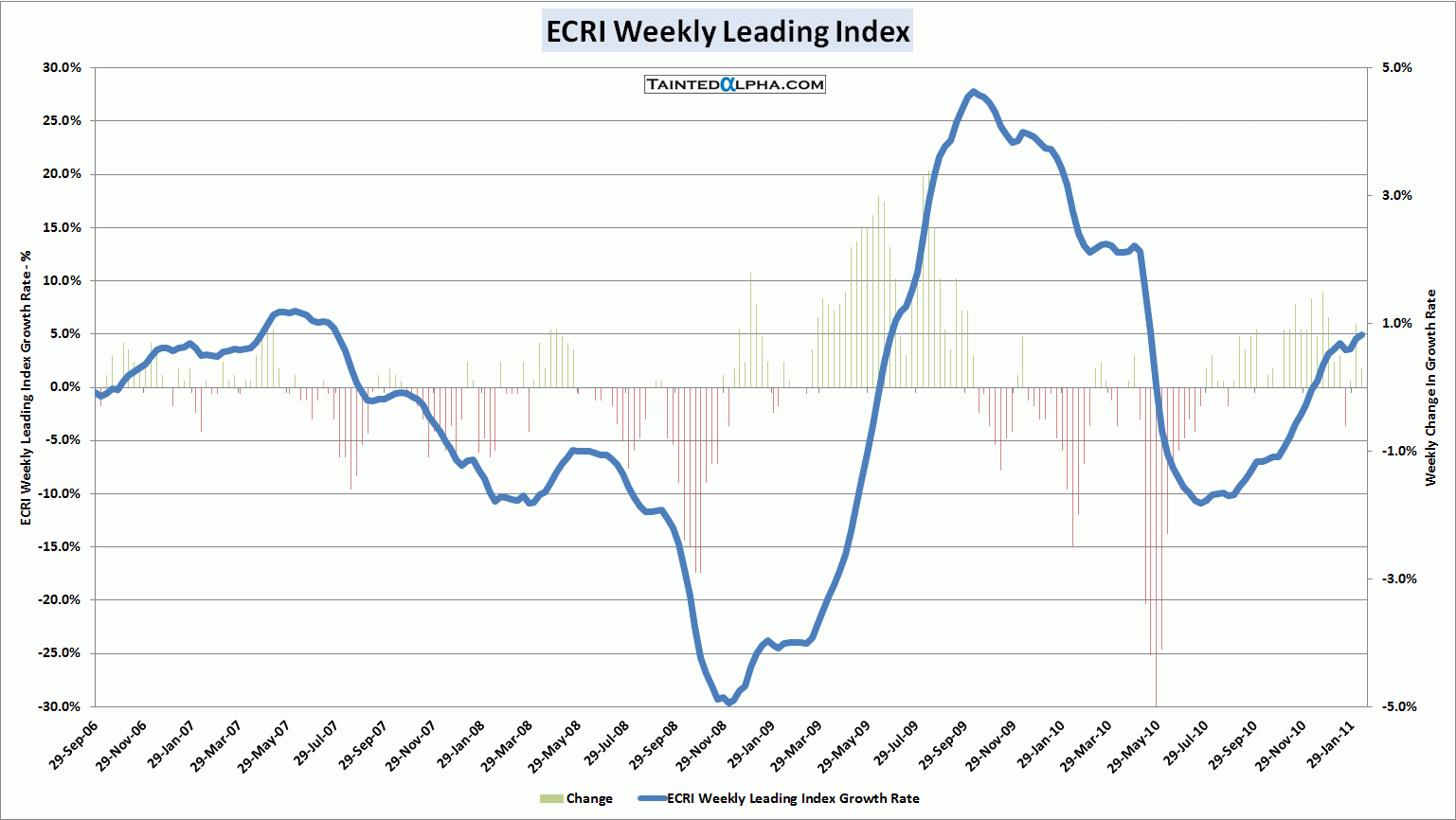 ECRI Weekly Leading Index for week ending February 11, 2011 was reported up 4.9% y-o-y. Prior reading was at 4.6%.
